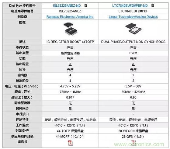 例如在查找四相輸出升壓控制器時,得出Renesas公司的ISL78225ANEZ,再經搜尋功能中“零件比較”的協助(如何比較?可訪問Digi-Key官網中「隱藏的搜索秘密」的零件搜索小技巧!)