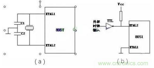 時鐘電路:(a)內部方式時鐘電路,(b)外接時鐘電路