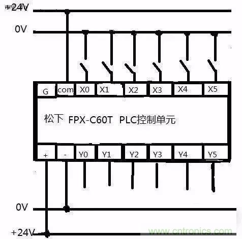 圖中松下PLC為直流匯點(diǎn)式輸入,即所以輸入點(diǎn)共用一個(gè)公共端COM,同時(shí)COM端內(nèi)帶有DC24V電源,在編寫(xiě)程序時(shí)注意外部設(shè)備使用的是常閉還是常開(kāi)觸點(diǎn)