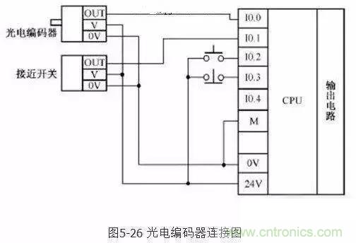 直流有源輸入輸入信號(hào)一般都是24V,這類(lèi)信號(hào)與其他無(wú)源開(kāi)關(guān)量信號(hào)混合接入PLC輸入點(diǎn)時(shí)電壓的0V點(diǎn)一定要接。上圖輸入點(diǎn)I0.0,I0.1連接光電編碼器,接近開(kāi)關(guān)的輸出OUT信號(hào),它們的驅(qū)動(dòng)電源由PLC自身的24V電壓提供