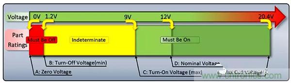 從0-1.2VDC, 繼電器一定處于斷電(關閉)狀態。(紅色區域)