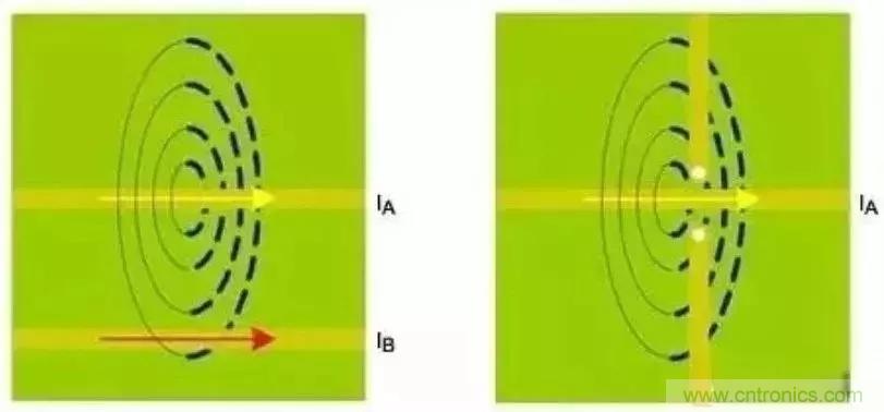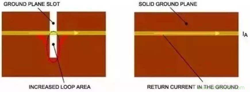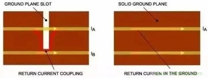 直流電流總是傾向于沿著低阻通路流通。同理,高頻電流也是優先流過最低電阻的通路。所以,對于地層上方的標準PCB微帶線,返回電流試圖流入引線正下方的接地區域。按照上述引線耦合部分所述,割斷的接地區域會引入各種噪聲,進而通過磁場耦合或匯聚電流而增大串擾(圖7)。