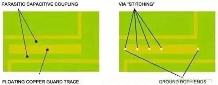 填充地也稱為保護線,通常將其用于電路中很難鋪設連續接地區域或需要屏蔽敏感電路的設計(圖8)。通過在引線兩端,或者是沿線放置接地過孔(即過孔陣列),增大屏蔽效應。請不要將保護線與設計用來提供返回電流通路的引線相混合,這樣的布局會引入串擾。