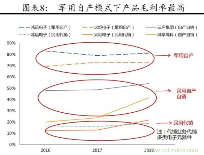 但自產自銷模式在民品領域的毛利率水平分化較大,在 20%~55%的較大毛利率分布 區間內浮動。擁有相對核心陶瓷技術的三環集團的毛利率水平明顯高于風華高科,兩者均受益于 2018 年的 MLCC 漲價潮,但風華高科的毛利率水平的波動顯著高于三環集團。
