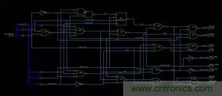 有了完整規(guī)畫后,接下來便是畫出平面的設(shè)計藍(lán)圖。在 IC 設(shè)計中,邏輯合成這個步驟便是將確定無誤的 HDL code,放入電子設(shè)計自動化工具(EDA tool),讓電腦將 HDL code 轉(zhuǎn)換成邏輯電路,產(chǎn)生如下的電路圖。之后,反覆的確定此邏輯閘設(shè)計圖是否符合規(guī)格并修改,直到功能正確為止。