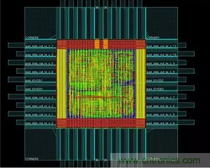 最后,將合成完的程式碼再放入另一套 EDA tool,進(jìn)行電路布局與繞線(Place And Route)。在經(jīng)過不斷的檢測后,便會形成如下的電路圖。圖中可以看到藍(lán)、紅、綠、黃等不同顏色,每種不同的顏色就代表著一張光罩。至于光罩究竟要如何運用呢?