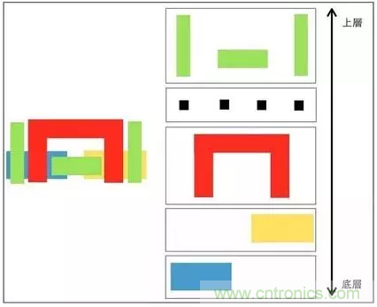 首先,目前已經(jīng)知道一顆 IC 會產(chǎn)生多張的光罩,這些光罩有上下層的分別,每層有各自的任務(wù)。下圖為簡單的光罩例子,以積體電路中最基本的元件 CMOS 為範(fàn)例,CMOS 全名為互補式金屬氧化物半導(dǎo)體(Complementary metal–oxide–semiconductor),也就是將 NMOS 和 PMOS 兩者做結(jié)合,形成 CMOS。至于什么是金屬氧化物半導(dǎo)體(MOS)?這種在芯片中廣泛使用的元件比較難說明,一般讀者也較難弄清,在這裡就不多加細(xì)究。
