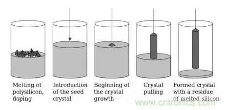接著,就是拉晶的步驟。首先,將前面所獲得的高純度多晶硅融化,形成液態(tài)的硅。之后,以單晶的硅種(seed)和液體表面接觸,一邊旋轉(zhuǎn)一邊緩慢的向上 拉起。至于為何需要單晶的硅種,是因為硅原子排列就和人排隊一樣,會需要排頭讓后來的人該如何正確的排列,硅種便是重要的排頭,讓后來的原子知道該如何排 隊。最后,待離開液面的硅原子凝固后,排列整齊的單晶硅柱便完成了。