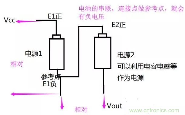 想產(chǎn)生負(fù)電壓,就讓他相對(duì)于電源負(fù)極的電勢(shì)更低即可。要想更低,必須有另一個(gè)電源的介入,根本原理都是利用兩個(gè)電源的串聯(lián)。電源2正極串聯(lián)在參考電源1的負(fù)極后。電源2負(fù)極就是負(fù)電壓了。