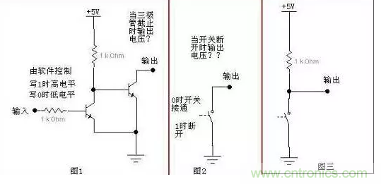 圖3中那個(gè)1k的電阻即是上拉電阻。如果開關(guān)閉合,則有電流從1k電阻及開關(guān)上流過,但由于開關(guān)閉和時(shí)電阻為0(方便我們的討論,實(shí)際情況中開關(guān)電阻不為0,另外對于三極管還存在飽和壓降),所以在開關(guān)上的電壓為0,即輸出電平為0。如果開關(guān)斷開,則由于開關(guān)電阻為無窮大(同上,不考慮實(shí)際中的漏電流),所以流過的電流為0,因此在1k電阻上的壓降也為0,所以輸出端的電壓就是5v了,這樣就能輸出高電平了。
