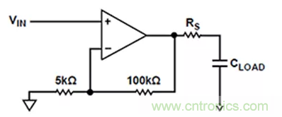 為解決這一問題,運算放大器設計人員提出了一種解決方案:在放大器輸出端與CLoad引腳之間加裝串聯電阻器,使器件能夠驅動大于1微法 (µF) 的負載(圖2)