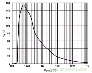 圖3:圖2中的電路在單位增益、±110V供電電壓及VOUT = 100Vp-p時,最大峰值為2dB對應的RS與CLOAD關系曲線圖。(圖片來源:Analog Devices)