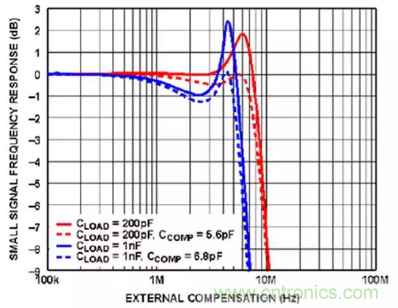 圖4:在單位增益、±110V供電電壓、VOUT = 100Vp-p、Rf = 0Ω 及 CCOMP = 5.6皮法 (pF) 時,ADHV4702-1的小信號頻率響應與外部補償的關系曲線圖。(圖片來源:Analog Devices)