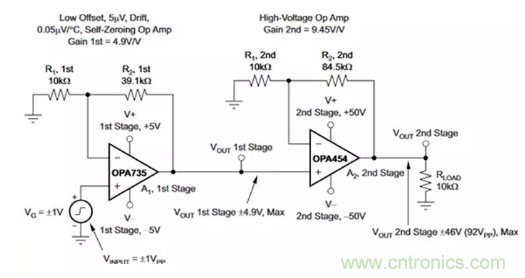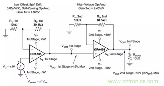 圖7:在OPA454的輸入路徑中加裝近零漂移運算放大器OPA735,會生成一個輸入失調溫度漂移非常低的兩級高壓電路。(圖片來源:Texas Instruments)