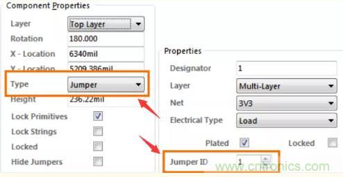 1.要設置為跳線的組件類型。2.跨接導線組件中的兩個極板的跳線ID設置為相同的非零值。注:一旦設置了組件類型和襯墊跳轉屬性,組件就會表現(xiàn)為跳線器。