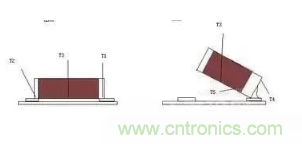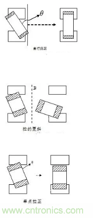 當貼片時,由于焊墊的不平或焊膏的滑動,造成片感偏移了θ角。由于焊墊熔融時產生的潤濕力,可能形成以上三種情況,其中自行歸正為主,但有時會出現拉的更斜,或者單點拉正的情況,片感被拉到一個焊盤上,甚至被拉起來,斜立或直立(立碑現象)。目前帶θ角偏移視覺檢測的貼片機可減少此類失效的發生。