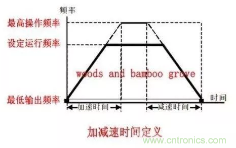加速時間是指變頻器從【輸出最低頻率】(可設置如臺達01-00參數)加速到【最高操作頻率】(可設置,如臺達01-05參數)所需時間。