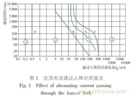 圖1示出了交流電流通過人體時(shí)的效應(yīng),圖中的曲線c是IEC測(cè)試得出的導(dǎo)致心室纖顫的曲線,曲線的橫坐標(biāo)是通過人體的15 ~ 100 Hz交流電流Ib,縱坐標(biāo)表示通電時(shí)間t。當(dāng)通過人體電流大小在曲線c的右側(cè)區(qū)域時(shí),不僅會(huì)出現(xiàn)肌肉收縮、呼吸困難、心房纖顫等病理反應(yīng),還會(huì)出現(xiàn)導(dǎo)致死亡的心室纖顫、心室停搏、呼吸停止等反應(yīng)。也就是說通過人體的電流和通電的持續(xù)時(shí)間在c曲線的右側(cè)即在 ④ 區(qū)內(nèi),人體就有死亡的危險(xiǎn)。另外曲線c是在實(shí)驗(yàn)室所指定的外界條件下測(cè)定和繪制,由于實(shí)驗(yàn)室所指定的外界條件可能與室外的條件有所不同,應(yīng)為室外條件的變化留出一些余量,因此以在區(qū)域 ③ 內(nèi)距離曲線c一段距離的曲線L作為人體是否安全的界限。查曲線L可知,當(dāng)Ib < 30 mA時(shí),人體就不會(huì)因電擊引起心室纖顫而致死。這就是國(guó)際上將防電擊的高靈敏度剩余電流動(dòng)作保護(hù)裝置RCD的額定剩余動(dòng)作電流IΔn定為30 mA的根據(jù)。