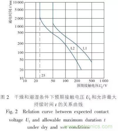 當(dāng)電流Ib通過人體阻抗為Zs時(shí),會(huì)產(chǎn)生電壓Ut,電壓Ut稱為接觸電壓,電流Ib是接觸電流,Ib越大,接觸電壓Ut也越大。實(shí)際工作時(shí),計(jì)算Ib較困難,而計(jì)算接觸電壓比較方便,于是IEC又提出在干燥和潮濕環(huán)境條件下相應(yīng)的預(yù)期接觸電壓Ut―通電時(shí)間t的曲線L1和L2(如圖2所示),這里預(yù)期的接觸電壓是最大的接觸電壓,為確保電氣安全和簡(jiǎn)化計(jì)算,在實(shí)際應(yīng)用中,接觸電壓都采用預(yù)期接觸電壓。
