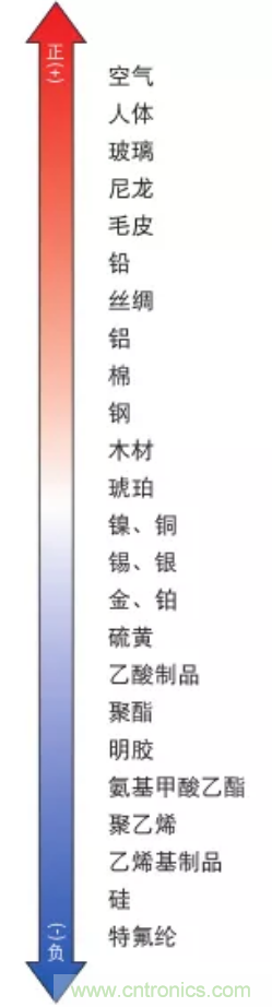 在該“帶電序列”中,正方向上的物體帶正電而負方向上的物體帶負電。此外,隨著物體在序列中距離的增加,相互之間摩擦時產生的靜電量也會越大。