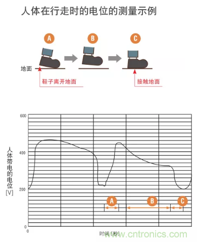 人體中有 80% 以上是水,因此靜電很容易流過人體。穿著鞋時,鞋底充當了絕緣體,防止靜電流動。這樣所產生的靜電就會聚集起來,無法釋放。下圖表明了人在行走時產生的靜電量。