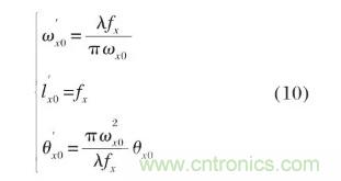 設圖3中X型柱面鏡為薄透鏡,焦距為fx,且焦點位于LD高斯光束的束腰位置,由公式(1)、(2)可得,在透鏡處的入射光束波前曲率半徑及腰斑半徑為:
