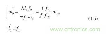 輸出透鏡L2的焦距為f2,其焦點位于ω0″處,由公式(8)可知,擴束單元輸出光束的束腰半徑及位置為: