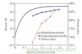實驗時,對LD加載4.0V的偏置電壓,使用激光功率計測量LD的輸出功率為376mW。為獲得光束整形后的功率密度,以光斑中心為圓心,測量不同直徑圓內多個點的激光功率并取平均值,通過差分計算出相鄰同心圓所形成的圓環內激光功率及圓環面積,二者求比值,得到不同圓環內的平均激光功率密度。文中測量的光斑直徑為1.00、1.25、1.50、1.75、2.00、2.25、2.50mm。圖12橙線為平均激光功率密度離散值所繪制的折線圖,其趨勢表明光斑半徑越大,激光功率密度越小。藍線為擬合離散數據,為高斯曲線,近似代表聚焦透鏡焦點處光斑功率密度的整體分布。圖13是不同光斑直徑下激光功率仿真結果(藍色曲線)與實驗結果(藍色折線)的對比,實驗結果與仿真結果基本吻合。紅色折線為不同直徑光斑內激光功率同二極管輸出總功率之比。由圖13可知,1mm直徑圓內激光功率為252mW,約占LD出射光束總功率的67%。說明光束整形系統在實現提高激光功率密度的同時具備較高的功率傳輸效率。