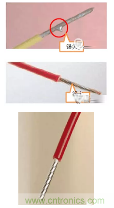 浸錫就是將金屬表面沾上一層錫,防止氧化,方便焊接。時至今日,浸錫在連接器行業中仍是廣泛應用,浸錫的好壞直接影響到產品的性能及使用壽命。我們都知道導體的電阻在電流的作用下會發熱,電流越大發熱量也就越高,浸錫工藝可以將一根一根細導線間的空氣用錫填滿從而減少發熱量。同時由于多股導線容易散,直接壓在接線端子上時,接觸面積會減少,所以很多廠家選擇浸錫的方式,以免接觸不良發熱燒壞。浸錫標準比較嚴格,需均勻,平滑,厚度0.05~0.1mm,不能有錫尖,凸錫球,漏錫,堆疊,變形等情況發生,否則反而會加大接觸電阻,增加發熱量。