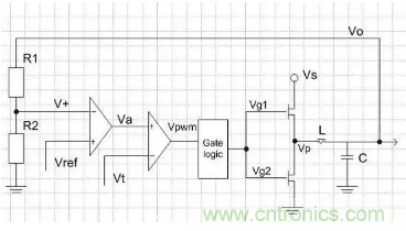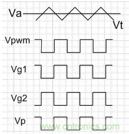 當(dāng)Vo上升時(shí),V+將上升,Va下降,Vpwm占空比下降,經(jīng)過們邏輯之后,Vg1的占空比下降,Vg2的占空比上升,Vp占空比下降,這又導(dǎo)致Vo降低,于是Vo的上升將被抑制。反之亦然。