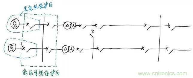我們繼續(xù)往后看。可以看到發(fā)電機(jī)接到了低壓母線,對于這個(gè)低壓母線的保護(hù)來說,要做到故障時(shí)只停母線而不停其它設(shè)備,只要讓保護(hù)在故障時(shí)切除和母線直接連接的四個(gè)斷路器就可以了。所以四個(gè)斷路器旁邊的電流互感器圍成的范圍就是這條母線保護(hù)的保護(hù)范圍。