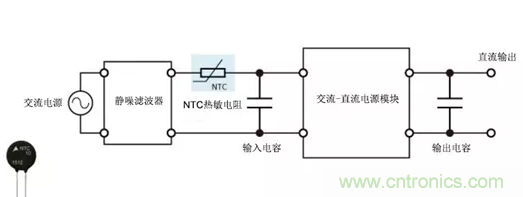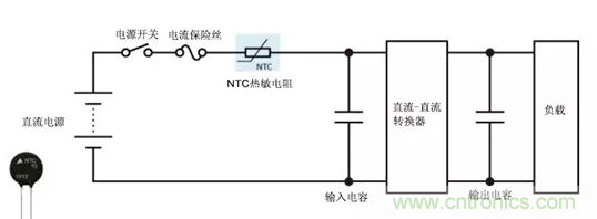在簡單的直流電源電路(例如直流-直流轉換器)中,NTC熱敏電阻可用作電源熱敏電阻并有效地限制沖擊電流,而輸入和輸出電容在電源打開時即可開始充電。NTC熱敏電阻在通電后其電阻會大大降低,因此與使用固定電阻相比,其功率損耗更低。