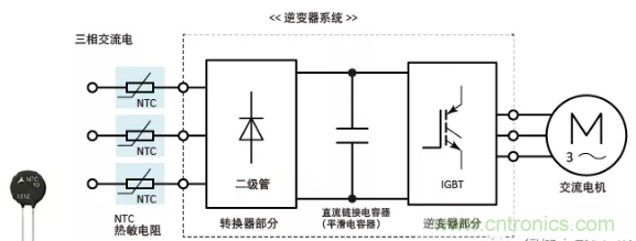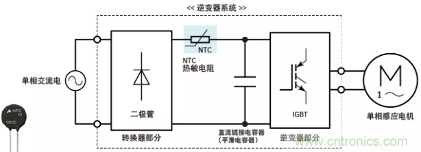 逆變器系統主要由轉換器級、逆變器級和直流側電容(平滑電容)組成,該電容放置在轉換器級之后,如下所示。上電時,器件會通過沖擊電流進行充電,而該沖擊電流的峰值是(為直流側電容充電的)穩定電流的若干倍。該沖擊電流可能會對直流電容的使用壽命產生不利影響,或損壞半導體器件。為了防止沖擊電流,我們需要連接NTC熱敏電阻。