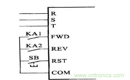3、找到變頻器的控制端子,在外面加裝2個中間繼電器,分別是KA1與KA2,接線方法如下圖所示,KA1工作時,變頻器正轉(zhuǎn),KA2工作時,變頻器反轉(zhuǎn),SB是復位按鈕,當有異常報警時,變頻器會停機,此時按下RST,可以消除報警,然后再重新啟動變頻器。
