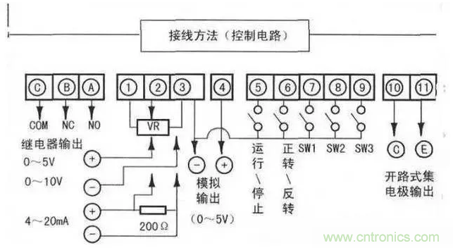 2、由于控制電路的頻率輸入信號是微小電流,所以在接點輸入的場合,為了防止接觸不良,微小信號接點應使用兩個并聯(lián)的節(jié)點或使用雙生接點。