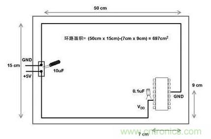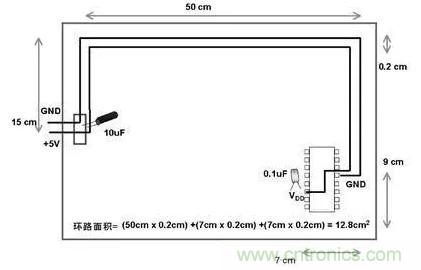 電源線和地線配合不當的PCB設計示例如圖2所示,此電路板上,設計出的環路面積為697cm²。采用圖3所示的方法,電路板上或電路板外的輻射噪聲在環路中感應電壓的可能性可大為降低。