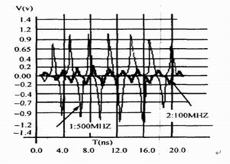 干擾源信號(hào)頻率越高,被干擾對(duì)象上的串?dāng)_幅值越大,我們對(duì)圖1中干擾源網(wǎng)絡(luò)AB上的信號(hào)頻率f1分別取不同頻率值時(shí),對(duì)被干擾對(duì)象上的串?dāng)_進(jìn)行了仿真,仿真結(jié)果見(jiàn)表2,信號(hào)頻率不同時(shí)的串?dāng)_波形見(jiàn)圖5,標(biāo)記為“1”、“2”箭頭所指的波形頻率分別為“500MHz”、“100MHz”。