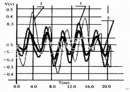 對(duì)于圖1所示的兩線系統(tǒng),我們進(jìn)行了三種情況的仿真(線網(wǎng)AB上的信號(hào)頻率均為100MHz)仿真結(jié)果見(jiàn)表3,及圖6.:第一種情況是在兩線間距和平行長(zhǎng)度不變的條件下,探測(cè)被干擾對(duì)象的串?dāng)_(標(biāo)記“1”);第二種情況是在兩線平行長(zhǎng)度不變的前提下,將兩線間距增加到10mils,然后探測(cè)被干擾對(duì)象的串?dāng)_標(biāo)記“2”;第三種情況是在兩線間距不變的條件下,將兩線的平行長(zhǎng)度增加到2.6inches標(biāo)記“3”,然后探測(cè)被干擾對(duì)象的串?dāng)_。由仿真結(jié)果可見(jiàn),當(dāng)兩線的間距拉大時(shí)(P由5mils變?yōu)?0mils),串?dāng)_明顯地減小了,而當(dāng)兩線的平行長(zhǎng)度加長(zhǎng)時(shí)(L由1.3inches變?yōu)?.6inches),串?dāng)_顯著增大了。