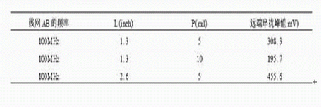 表3 兩線間距P和平行長(zhǎng)度L取不同值時(shí)的串?dāng)_峰值