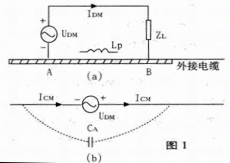由于共模電流ICM是由差模電流IDM產(chǎn)生的,所以這種模式稱電流驅(qū)動(dòng)模式。以下舉二例說(shuō)明電流驅(qū)動(dòng)產(chǎn)生的共模輻射。