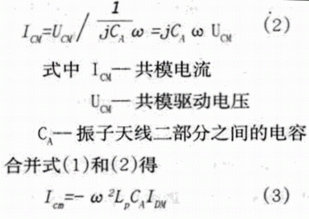 這里UCM就是產(chǎn)生共模輻射的驅(qū)動(dòng)源。要產(chǎn)生輻射,除了源以外還必須有天線。這里的天線有兩部分組成,一部分是由A點(diǎn)向左看的地線部分,另一部分是由B點(diǎn)向右看的地線部分和外接電纜。其組成的輻射系統(tǒng)的等效電路如圖1(b)所示,這實(shí)際上是一付不對(duì)稱振子天線。流過(guò)天線的電流即為共模電流,可用下式表示