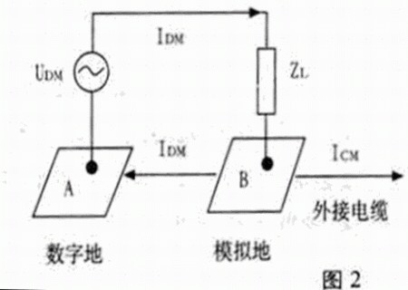 例1:在印制電路板上為了把數(shù)字部分和模擬部分隔離,常把地分割成數(shù)字地和模擬地。如果這兩部分之間有信號(hào)聯(lián)系,如圖2所示,并且數(shù)字地和模擬地的連接部分AB比較細(xì)長(zhǎng),存在一定電感,則差模電流IDM將在AB連接線的電感上產(chǎn)生共模驅(qū)動(dòng)電壓源,從而引起共模輻射,天線一部分是數(shù)字地,另一部分是模擬地和外接地線。