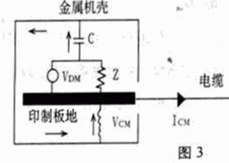 例2:印制電路板的地通過(guò)接地導(dǎo)線與機(jī)殼相連,如圖3所示。印制板上有信號(hào)線與機(jī)殼貼近,于是差模源VDM通過(guò)分布電容C耦合到機(jī)殼上,引起差模電流,該電流通過(guò)機(jī)殼和接地線又回到印制板的差模源。如果接地線存在一定的電感L,則差模電流在L上產(chǎn)生電壓降VCM,成為共模驅(qū)動(dòng)電壓,從而引起共模輻射。這時(shí)天線的一部分是外接地線,另一部分是機(jī)殼。這種輻射常發(fā)生在以下情況,例如設(shè)備內(nèi)部的地址線、數(shù)據(jù)線等扁平電纜貼近機(jī)殼,分布電容較大,印制板和機(jī)殼之間的連接線細(xì)長(zhǎng)或接觸不良等等。