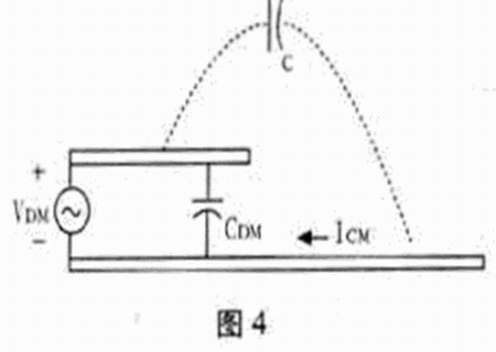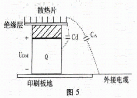 圖5是電壓驅(qū)動(dòng)模式的一個(gè)實(shí)例。圖中Q是大功率的開(kāi)關(guān)管,Q可看成是差模電壓源UDM,共模電流ICM的途徑是由Q通過(guò)開(kāi)關(guān)管和散熱片之間的分布電容Cd到達(dá)散熱片,散熱片是共模天線的一個(gè)極。然后以空間位移電流的形式,即通過(guò)C A到達(dá)外部接線,外部接線是天線的另一個(gè)極,共模電流再由印制板地回到Q。