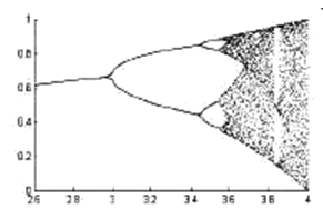 時系統分別產生周期2和周期4不動點。系統發生混沌的臨界值