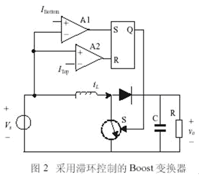 [page] 如圖2所示為一種常見的DC/DC控制策略——滯環控制策略。該控制策略限定了電感電流波動的最大值ITop和最小值Ibotton,電感電流波形如圖3a所示。此時,電感電流為周期的,變換器有固定的開關周期T。設電感電流為ILp(t),則
