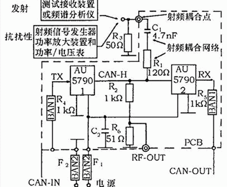 單線CAN通過單根總線連接,一般應用于低速場合,典型傳輸速率33 kb/s,最多可連接32個節點。圖3所示的測試PCB上安裝了兩個單線CAN收發器AU 5790,電源線BAN2(包含電源濾波電感器)濾波器F1和F2給收發器提供工作電壓。收發器1接收經BAN1(包含1 kΩ的串聯電阻)輸入的CAN信息,并經CAN-H發送到收發器2,收發器2再將信息經BAN1從測試板輸出。測試儀器通過射頻耦合網絡與CAN-H連接。