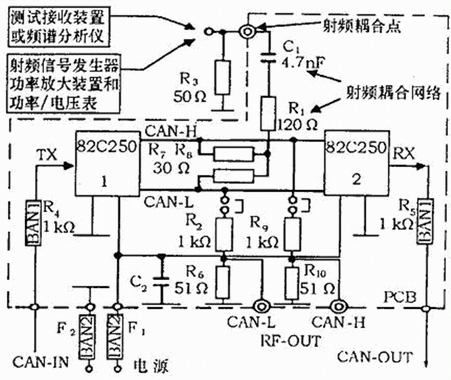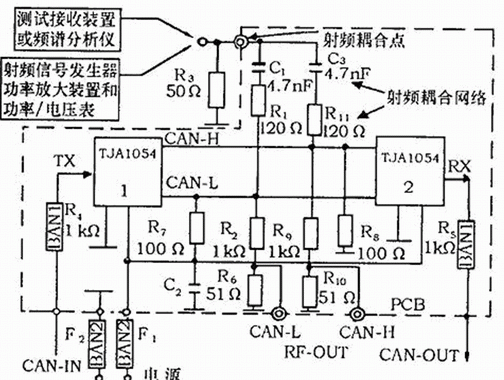 由于被測裝置將在汽車上使用,所以測試方法應從現在的汽車EMC測試國際標準ISO 11451、CISPR25、ISO 11452中挑選。這些標準對應不同的測試裝置和耦合方法,提供了一系列的測試方法。選擇EMC測試方法的依據是在有限設備的支持下,測試中以反復地進行。為此,需要在被測電路和測試儀器之間提供一種已知的、易復現的耦合方式。對于評價收發器類型的集成電路,采用被測裝置和測試儀器之間直接耦合的方法即可達到上述要求。國際標準ISO 11452-7提供了直接耦合的測試方法,可用于元件級抗擾性的測試。