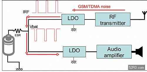 防止GSM噪聲降低音頻質(zhì)量的最佳方法,就是使用具有很低壓降(LDO)和低輸出噪聲的線性穩(wěn)壓器(LR)從鋰離子電池直接給音頻放大器供電。這種LDO線性穩(wěn)壓器用作放大器電源的“清理”或濾波模塊。