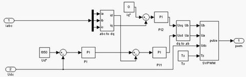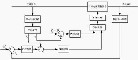 其中,空間電壓矢量控制通過合理地選擇、安排開關狀態的轉換順序和通斷持續時間,改變多個脈沖寬度調制電壓的波形寬度及其組合,達到較好的控制。相對SPWM控制,具有電壓利用率高、諧波含量小、大大改善了系統的靜態和動態性能,具有結構簡單、容易實現、控制精度高等特點。本文采用空間矢量控制的控制策略,并對整流電路采用電壓外環PI和電流內環PI控制相結合的方法,建立三相電壓型PWM矢量控制方案的仿真模型,并對其進行分析研究。